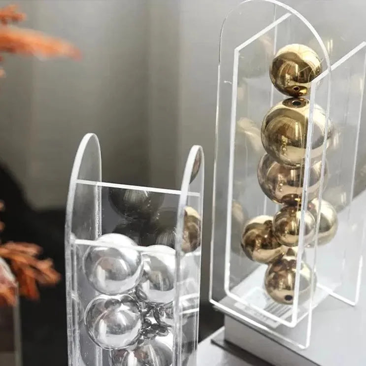Enhance your workspace or living area with this Abstract Art Metal Ball in a Square Transparent Acrylic Box, a modern decorative ornament that combines geometric elegance and contemporary design.