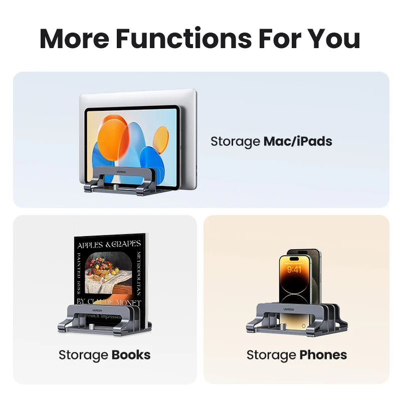 Keep your desk neat, organized, and efficient with the UGREEN Vertical Laptop Stand — designed to hold MacBook Air, MacBook Pro, tablets, and phones securely.